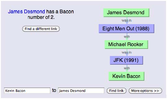 That “6 degrees” theory is totally amazing! Can’t wait to learn what your new friend/old friend connection is! So I went to the Oracle of Bacon site…and this is kind of funny…my Dad had a teenie weenie part in a movie called “Eight Men Out”…so just for kicks, I typed my Dad’s name in there and look what turned up!! -Kate