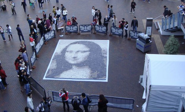 3,604 cups of coffee which have been made into this giant Mona Lisa painting. The cups of coffee were each filled with different amounts of milk to create the different tones and shades.