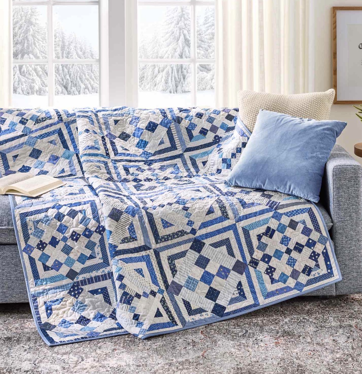True Blue is a scrap-friendly patchwork throw that celebrates classic quilt blocks with a fresh layout and calming blue palette. It’s the kind of quilt that looks just as good tossed over a sofa as it does folded at the foot of a bed—and even better when you know it’s made from fabrics you already love.