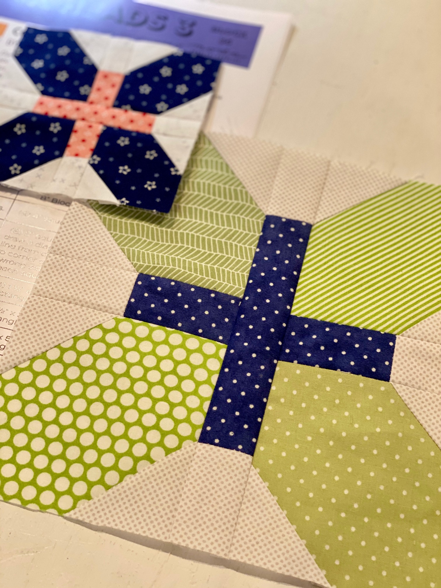 When picking out my fabrics for this weeks block, I loved the combinations but once I got it all sewn together I was not thrilled with the choice for my center block, so I auditioned a few other fabrics to replace the centers. Should it be green, how about blue, maybe I should go with the navy pindot?